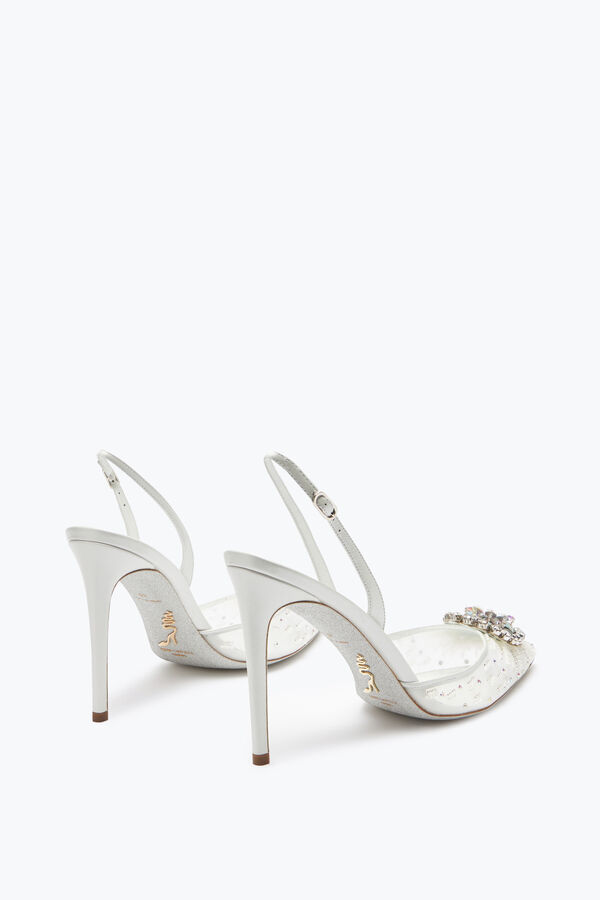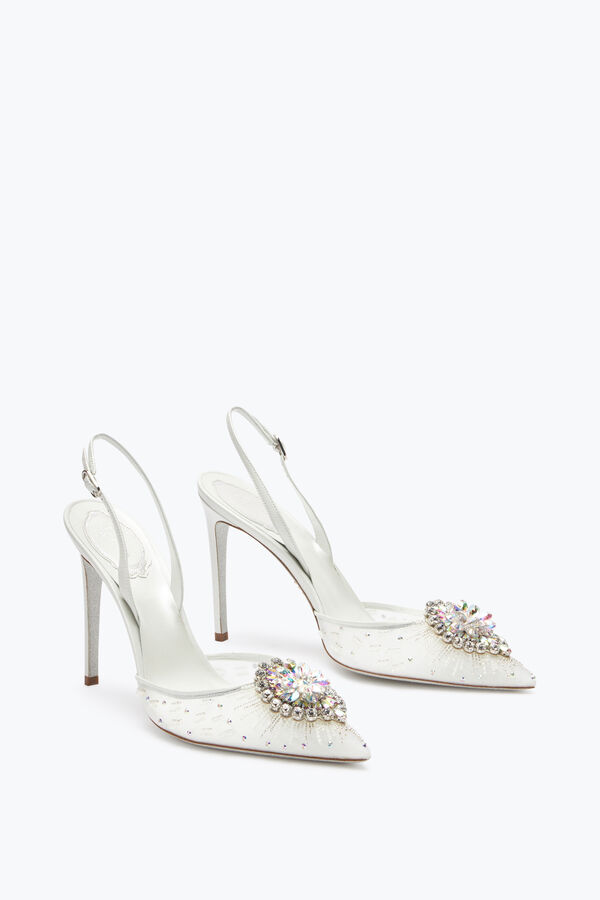 From its shimmering white to the sparkle of hand-embroidered crystals and rhinestones, the Barbara slingback is a statement of elegance and craftsmanship at every step. With its luxurious embellishment on the toe and iconic stardust sole, this total white style with its stiletto heel completes any formal look, adding a touch of sophistication. Made in Italy.