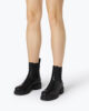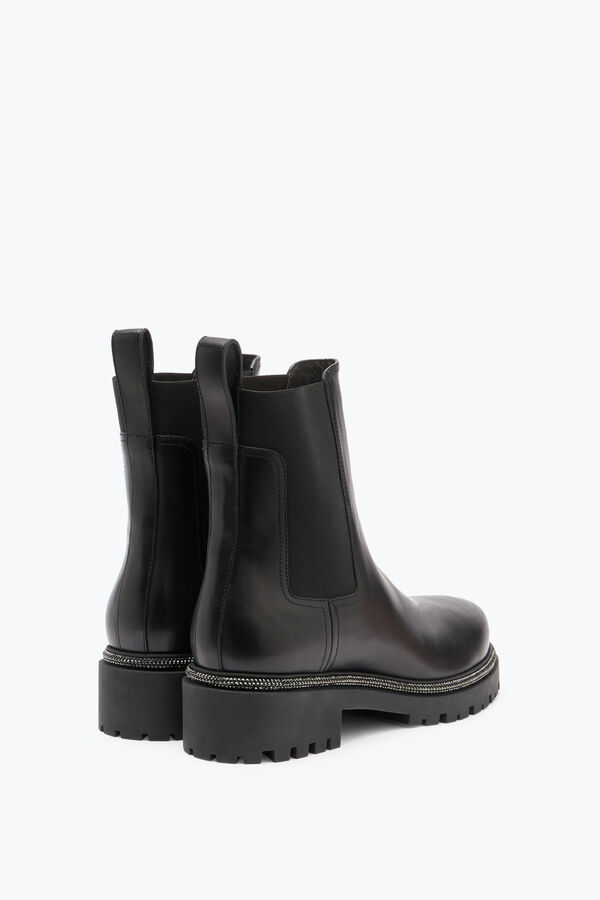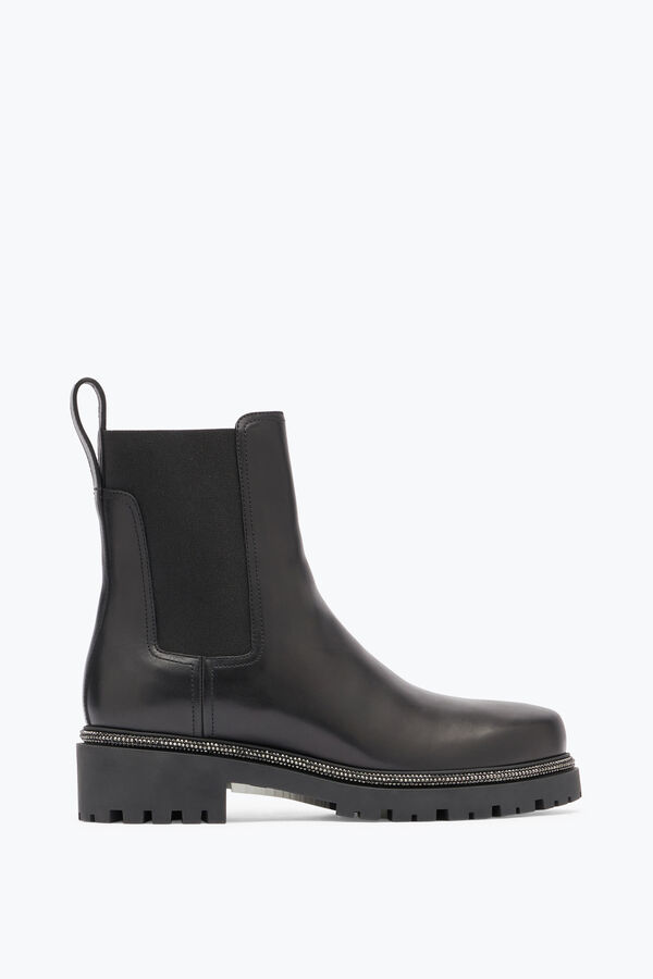 The black leather ankle boots BIKA combine sober and urban style in a single concept. This model sports a silhouette with a rounded tip and seams that enhance the shoe’s style. The elasticated insert on the side and the eyelet behind the heel facilitate the fit. Three rows of matching rhinestones underline the junction between the uppers and the lugged sole, giving the model a touch of light. Perfect to wear for daily tasks, to combine comfort and style.
