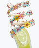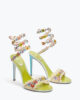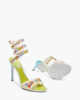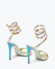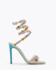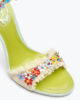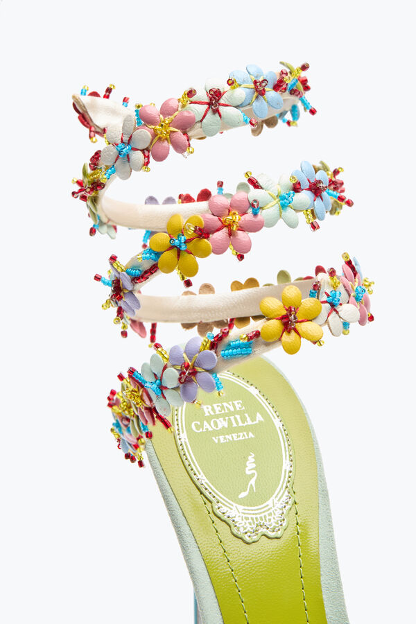 A tribute to the beautiful, color-filled warm season, the archive-inspired Bloom style stands out with hand-embroidered corollas of multicolored flowers adorning the upper and serpent, and finished with a light blue heel and green sole.