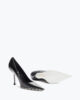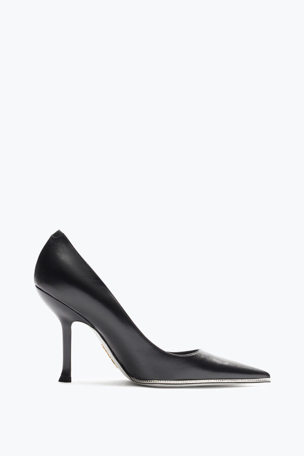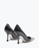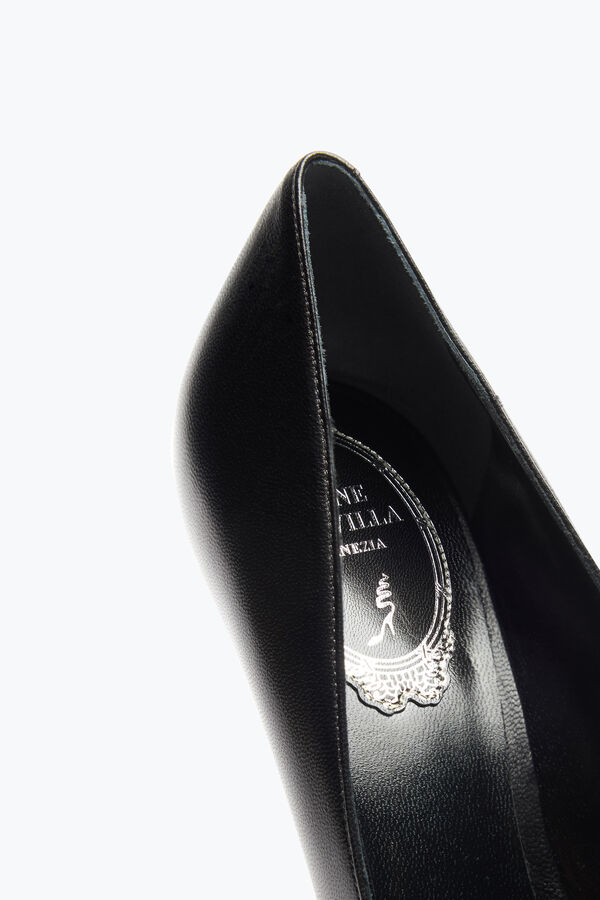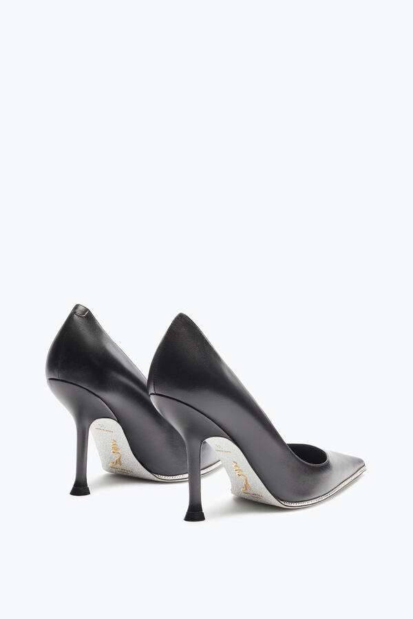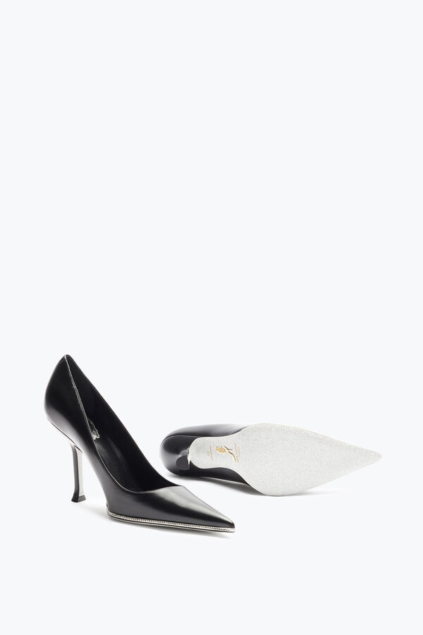 An edgy design is the distinctive feature of the Candice pump. In classic black, a passe-partout color for every occasion, it is characterized by the row of silver crystals that runs along its profile, giving it the shimmering and distinctive touch of the maison.