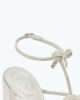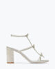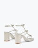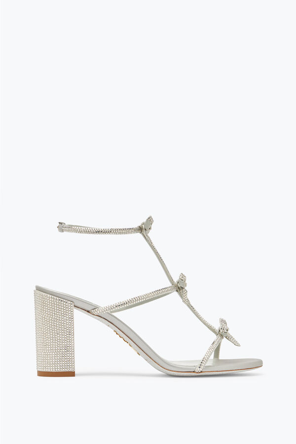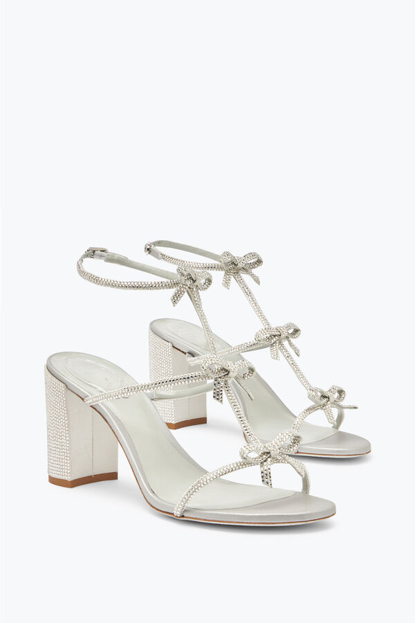 The Caterina sandal promises modern romance and glamor. Defined by three crystal-studded bows, this style features a practical block heel that ensures a comfortable fit and is available in a silver shade, ideal paired with jeans and a shirt and equally with a light printed caftan.