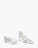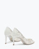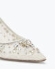 The white Cinderella lace pump is an emblem of hand-made Italian virtuosity that plays with transparencies and pearlized nappa leather. Embellished with a refined decoration of assorted crystals along the fine lace upper, this mid-height stiletto design is a wedding favorite. – Heel height 3,1- Pointed toe- Lace and nappa- Leather sole