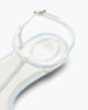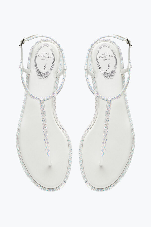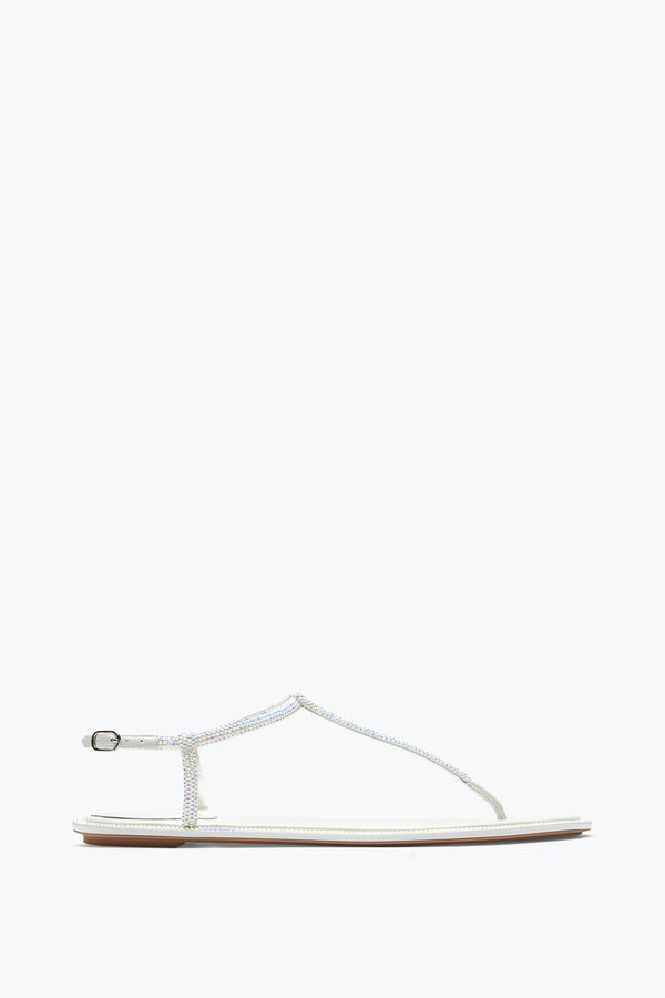 In the city or at the seaside, the Diana flat sandal is officially confirmed as a must-have essential. In pure white, with iridescent crystals that enrich the bands and practical ankle strap, it is versatile, sophisticated and suitable from the office to evenings out.
