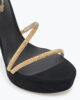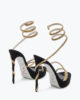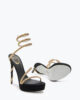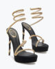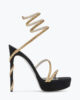 The epitome of sassy bold elegance, the platform version of the Margot in black and gold dares to dare. The signature crystal-embellished snake spirals up, coiled around the heel and ankle, elongating the leg with unabashed sensuality. – Made in Italy- Heel height 5,1- Almond toe- Suede and satin- Leather sole