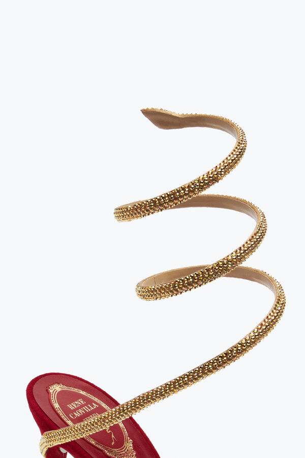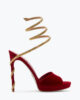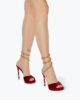 Sensuality and charm are what make the Margot sandal unique and modern. In ruby-colored velvet with a stardust sole, this Made in Italy style stands out for the gold serpente that wraps around the heel and ankle, creating a sophisticated color-block effect.