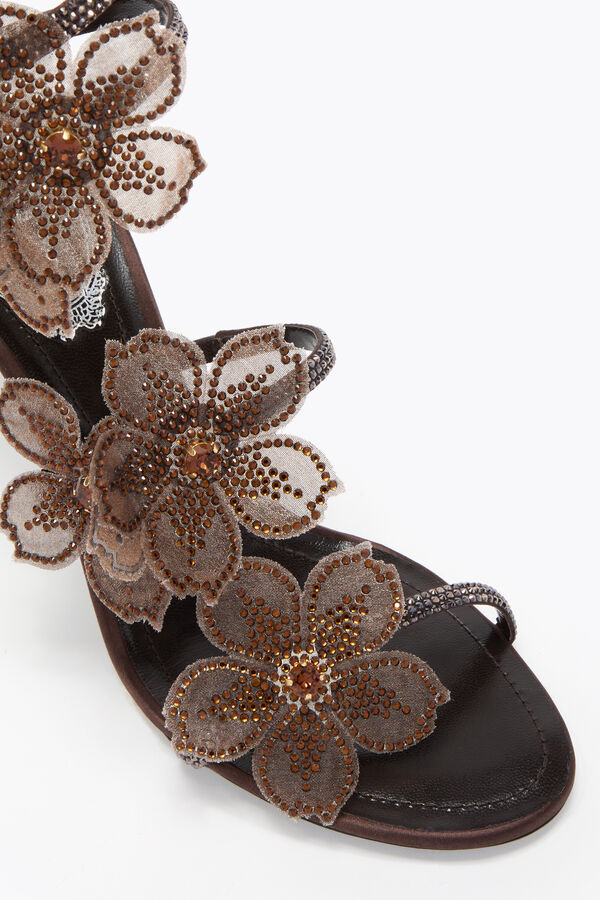 A perfect synthesis of craftsmanship and refinement, the Peach Flower is reinterpreted for the autumn season in a warm chocolate shade. The tulle and lace flowers, embellished with tone-on-tone crystals, embody the essence of the maison.