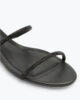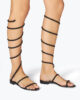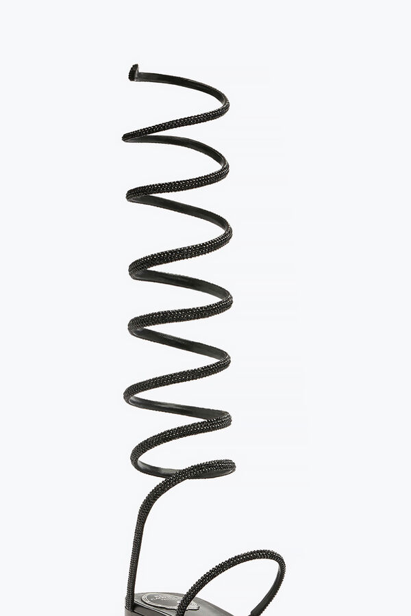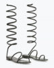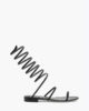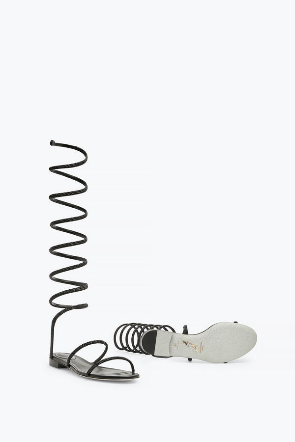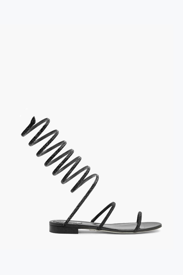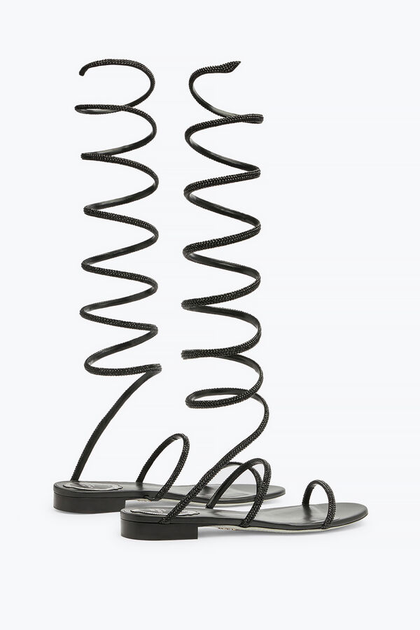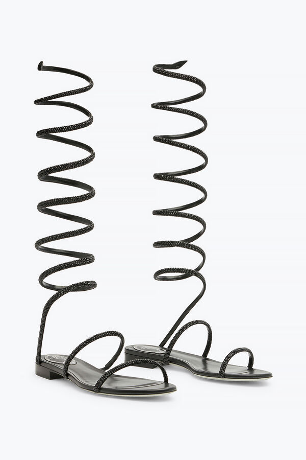 The power of black adds extra desirability to the flat Supercleo sandal, whose elongated coiled snake strap wraps all the way up the leg with elegance and sensuality. This unique head-turning design defined by two upper straps and a signature silver-dusted sole is the perfect day-into-night must-have. – Made in Italy- Heel height 0,4- Round toe- Satin and nappa- Leather sole
